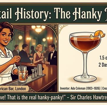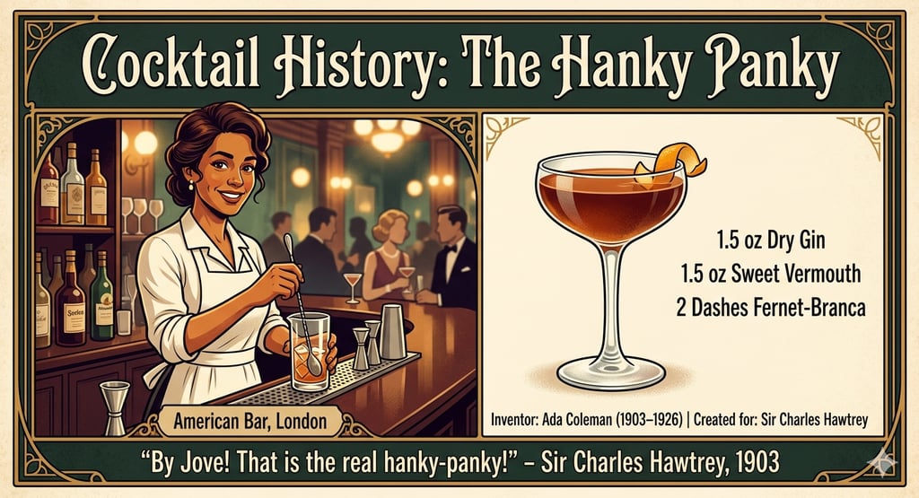 The Hanky Panky cocktail was created in the early 20th century by Ada Coleman, a pioneering bartender at the Savoy Hotel in London. This iconic drink is a delightful blend of sweet vermouth, gin, and a unique ingredient: Fernet-Branca, an Italian digestif known for its complex, bitter flavor. The creation of this cocktail can be traced back to a legendary moment when a distinguished guest, Sir Charles Henry Gill, requested something new from Coleman. Inspired by his desire for an adventurous cocktail, she creatively combined these ingredients, giving birth to what would become the Hanky Panky.